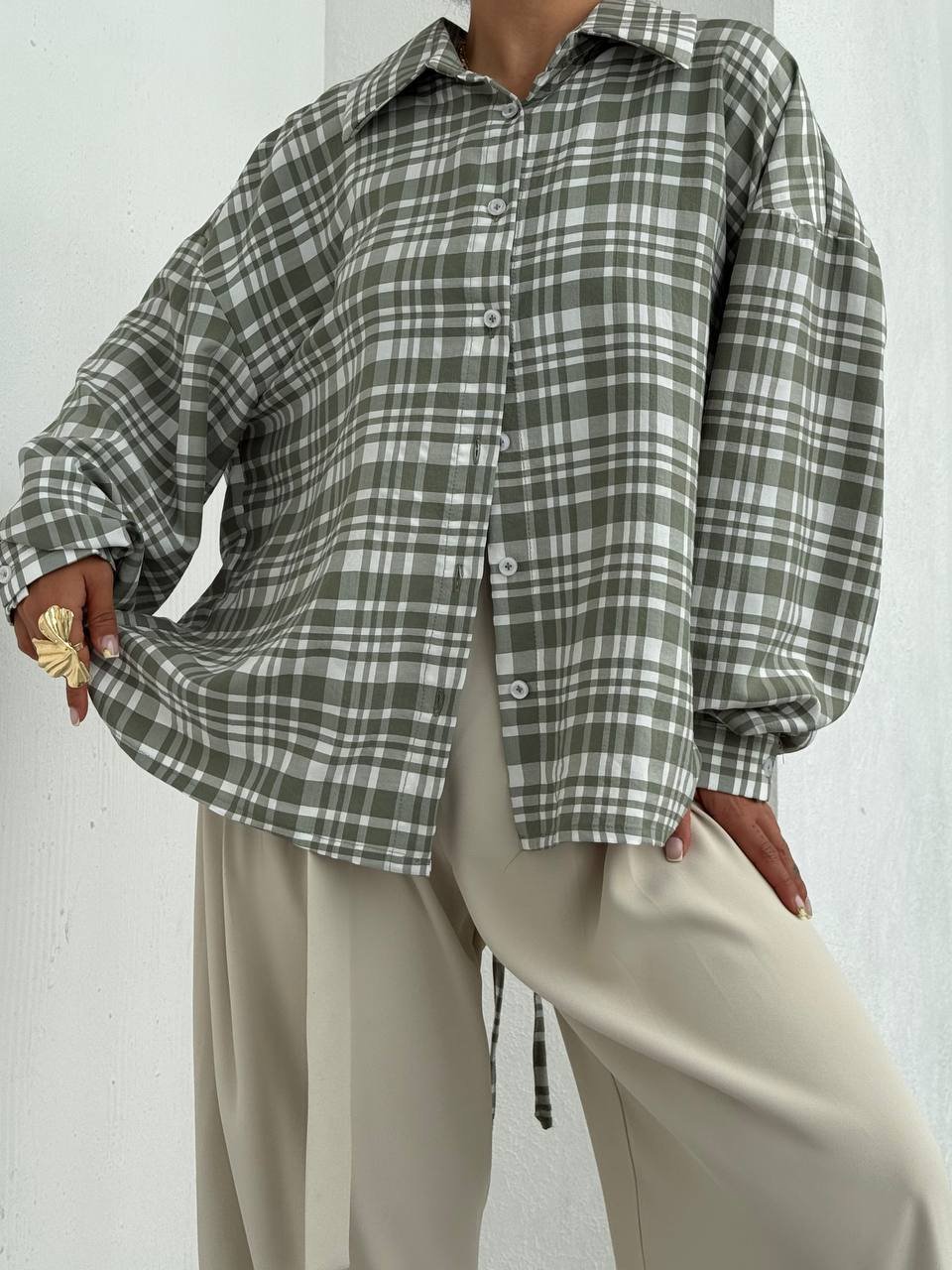 شومیز چهارخونه سدری پشت بندی زیتون Olive کد : 103803