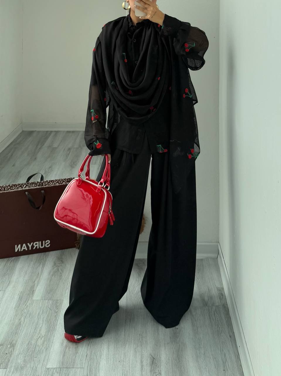 - طرح های گل و گیلاس به صورت رندوم در لباس میباشد